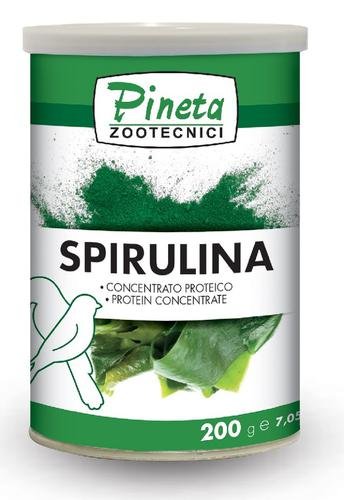 SPIRULINA POLVOConcentrado proteínico Informaciones adicionales:La espirulina es una fuente natural de proteínas, aminoácidos, betacarotenos y ácidos grasos esenciales (ácido gamma-linolénico). Indicado para favorecer la síntesis de pigmentos que dan el color oscuro de plumas y piel, mejora el plumaje, proporciona energía, aumenta la resistencia física, fortalece el sistema inmunológico y preserva la flora intestinal. Tiene propiedades tonificantes, reconstituyentes y antioxidantes; depura y desintoxica al organismo, contrarrestando la acción de los radicales libres.Modo de empleo:Uso: mezclar cuidadosamente con el pienso o pasta.Dosis: 5-10 g por kg de pienso. Recomendaciones:Se recomienda su uso diario especialmente durante el período reproductivo, para aumentar al valor proteico del pienso o pastas, también durante la muda favorece los pigmentos responsables del color oscuro de las plumas y la pielPienso complementario para aves de compañía y/u ornamentales.Tónico, reconstituyente equilibrado de alto contenido proteico (por 100g).Composición: Alga Espirulina 100%Formatos disponibles: 100gr y 200gr