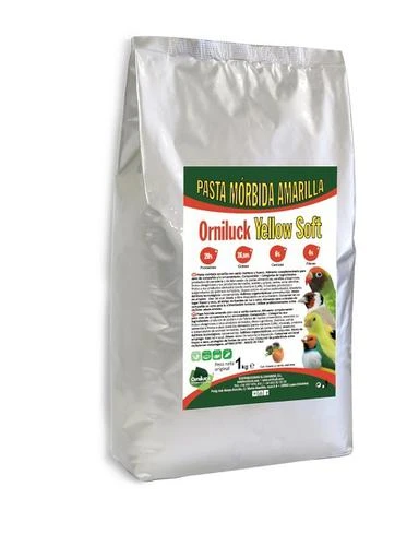 Orniluck Yellow Soft Pasta Amarilla Mórbida con Cardo Mariano Profesional. Fórmula nutritiva y altamente equilibrada, Contiene todos los nutrientes esenciales para la primera fase de la vida de las aves, con vitaminas, proteínas, extractos de vegetales y aminoácidos, Es muy apetitoso y alta en proteínas. Recomendada en época de Muda/Preparación/CríaVENTAJAS:• Recomendada en época de Muda/Preparación/Cría• Alta en proteínas• Elaborado con ingredientes de calidad.• Fórmula equilibrada y nutritiva• Rico en vitaminas y extractos de vegetales• Ideal para la preparación de las hembras para la cría• Ayuda al crecimiento de los pollos.• Con Cardo MarianoProteínas: 20,00%Grasas: 16,50%Cenizas: 4,00%Fibras: 6,00%Recomendado para:Carduelis | Exóticos | Canarios | Periquitos | AgapornisModo de empleo: uso tal cualDosis: a libre disposición en el comedero.Composición-categorías de ingredientes: productos y subproductos de granos de cereales, productos y subproductos de semillas y frutos oleaginosos, productos y subproductos de otras plantas, productos y subproductos de la industria azucarera de remolacha, semillas cardo mariano, minerales, levaduras.Aditivos tecnológicos: contiene ligantes, antiaglomerantes, coagulantes, conservantes, antioxidantes autorizados en la UE.Aditivos organolépticos: contiene aromatizantes autorizados en la UE.S.